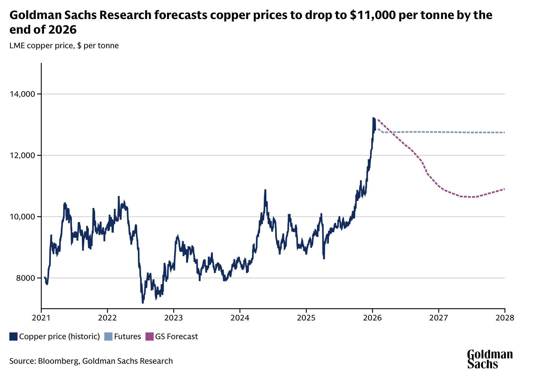 Після різкого зростання цін на мідь у листопаді-грудні 2025 року аналітики Goldman Sachs очікують поступового зниження вартості металу протягом 2026 року. Попри тимчасову підтримку ціни на рівні близько $13 000 за тонну у першому кварталі, прогноз на кінець року – $11 000 за тонну.
