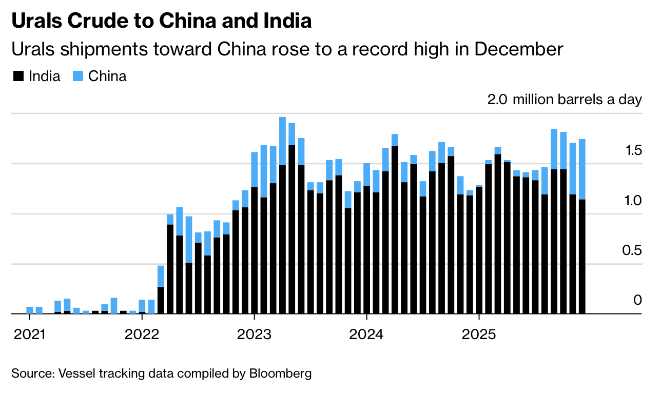 У грудні відвантаження Urals до Китаю сягнули 600 тис. барелів на добу — це найвищий рівень із 2018 року. З урахуванням того, що понад 20 танкерів ще не розвантажені, а частина з них досі не має фінального пункту призначення, фактичні обсяги можуть виявитися ще вищими.