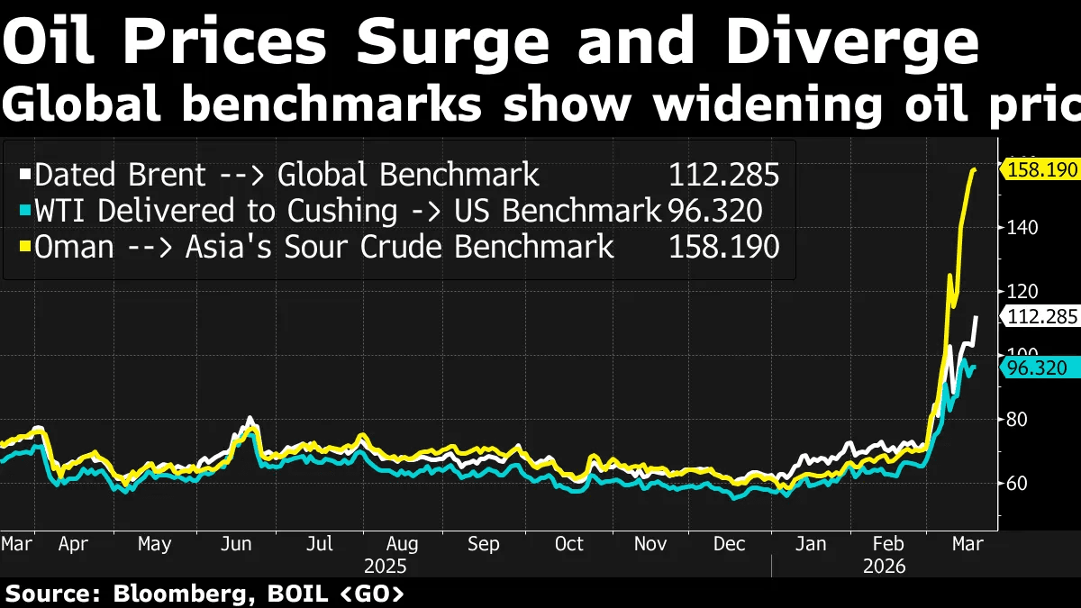 Світові еталони показують розширення розриву в цінах: Dated Brent залишається глобальним еталоном, WTI з поставкою в Кашинг слугує еталоном для США з ціною 96,32 дол., а Oman є еталоном кислої нафти для Азії з цінами 112,29 та 158,19 дол.